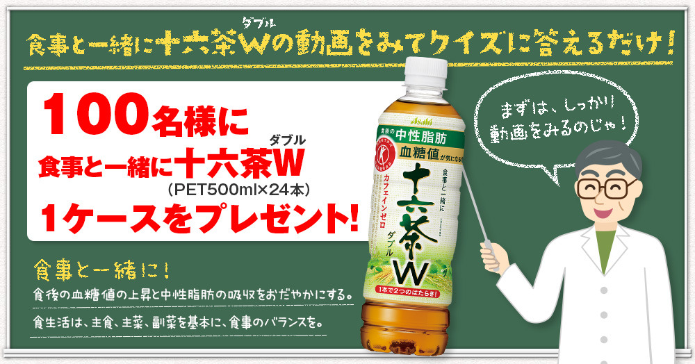 食事と一緒に十六茶W(ダブル)の動画を見て、クイズに正解した方の中から抽選で、十六茶W(ダブル)1ケースをプレゼント!